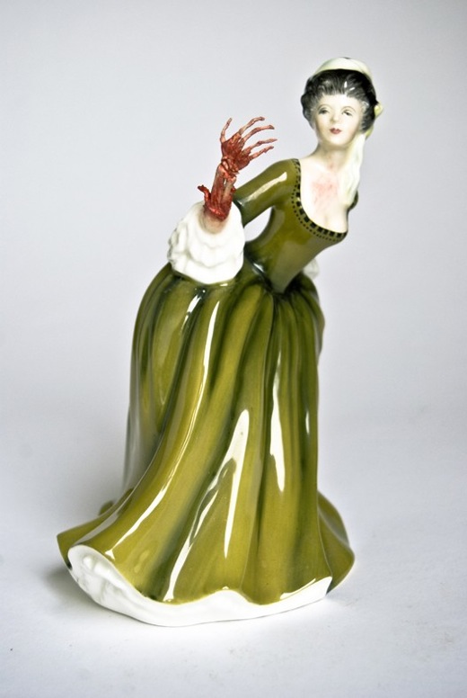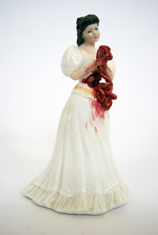 Or, Jessica Harrison détourne ces objets : porcelaine rime avec raffinement, subtilité, fragilité, robe de princesse avec féminité et beauté. Ces figurines témoignant d’une vie passée, sont disséquées, disséquées, estropiées, décapitées, dépecées… L’artiste donne dimension organique à ces figurines en porcelaine : cette matière si fragile et d’une finesse incomparable s’oppose à la brutalité des blessures infligées aux figurines.