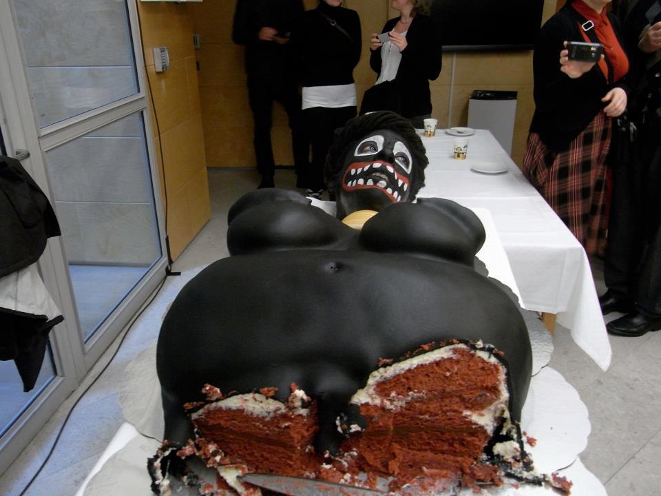Lena Adelsohn Liljeroth, actuelle Ministre de la Culture en Suède qui semble joyeuse (avec un public manifestement amusé), sur le point d’offrir une part de gâteau à un Noir qui a prêté sa tête pour l’occasion. Elle a en dessous d’elle, un gâteau sous la forme d’une femme africaine stéréotypée pour la journée mondiale de l’art au Musée d’Art Moderne de Stockholm, le 15 avril 2012. Le gâteau baptisé « Mutilation génitale féminine » était l’oeuvre de l’artiste Makode Linde et était censé nous sensibiliser sur l’excision encore pratiquée couramment dans certains pays d’Afrique. C’est pourquoi d’ailleurs Adelsohn Liljeroth coupe d’abord symboliquement le « clitoris » du gâteau ( …)