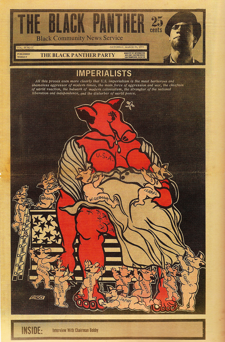 Emory Douglas produit et retranscrit les codes graphiques selon lesquels le cochon symbolise le policier blanc commettant des actes de violence sur les membres de la communauté noire. Par extension, l’animal représente également l’idéologie capitaliste et ses méfaits sur les sociétés à l’échelle internationale. Sont dénoncés la colonisation, la ségrégation raciale, l’inégalité des richesses ainsi que les guerres menées par les Etats-Unis.