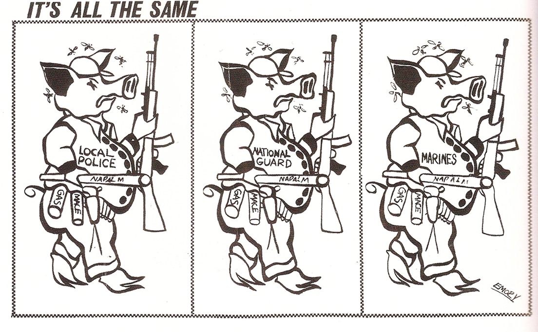 ED : Huey and Bobby. They used to call them pigs, swine. See, when it first started, Huey asked me to do a cartoon of a pig. And we were going to put the badge number on this pig each week, who was harassing people in the community. So after that, doing that pig, I had in my mind, how can I improve it? And it just came to me that I could just stand the pig up on his hoofs, and dress him up like a cop, but still have the character of a pig.*