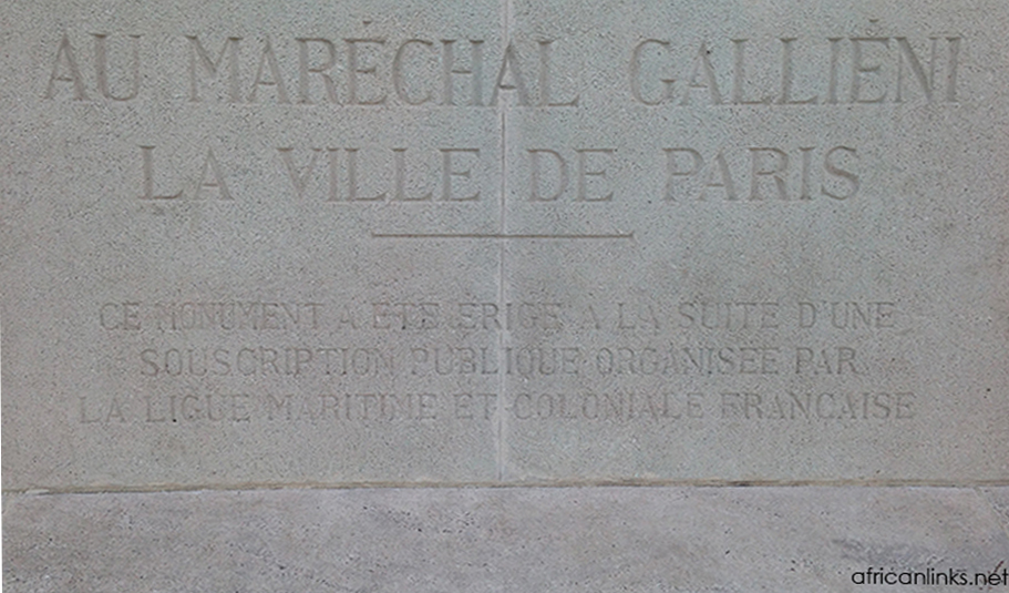 Sur le bas relief du monument, nous pouvons lire : « Au Général Gallièni – La Ville de Paris – Ce monument a été érigé à la suite d’une souscription organisée par la ligue maritime et coloniale française »