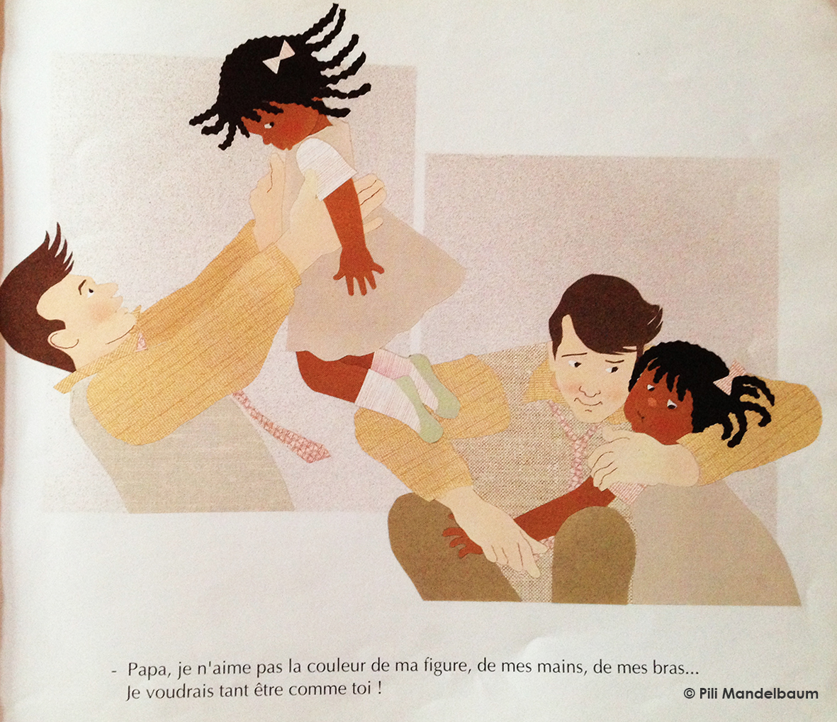 Ici, la petite fille a parfaitement conscience de sa couleur et accepte parfaitement son identité. Or, elle ne peut s’identifier à 100% à cette nouvelle poupée, car la chevelure de la poupée est beaucoup trop lisse.
