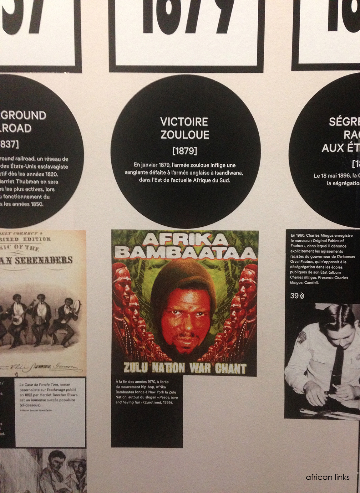 Une frise murale reprend de grands faits historiques en établissant un lien avec des focus musicaux. Ce parallèle entre l’histoire et la musique est intéressant : l’histoire influence la musique, et l’histoire peut subir l’influence de la musique. Ainsi, nous pouvons apprendre que Harry Belafonte était proche de Martin Luther King ou Fela Kuti de Malcom X.