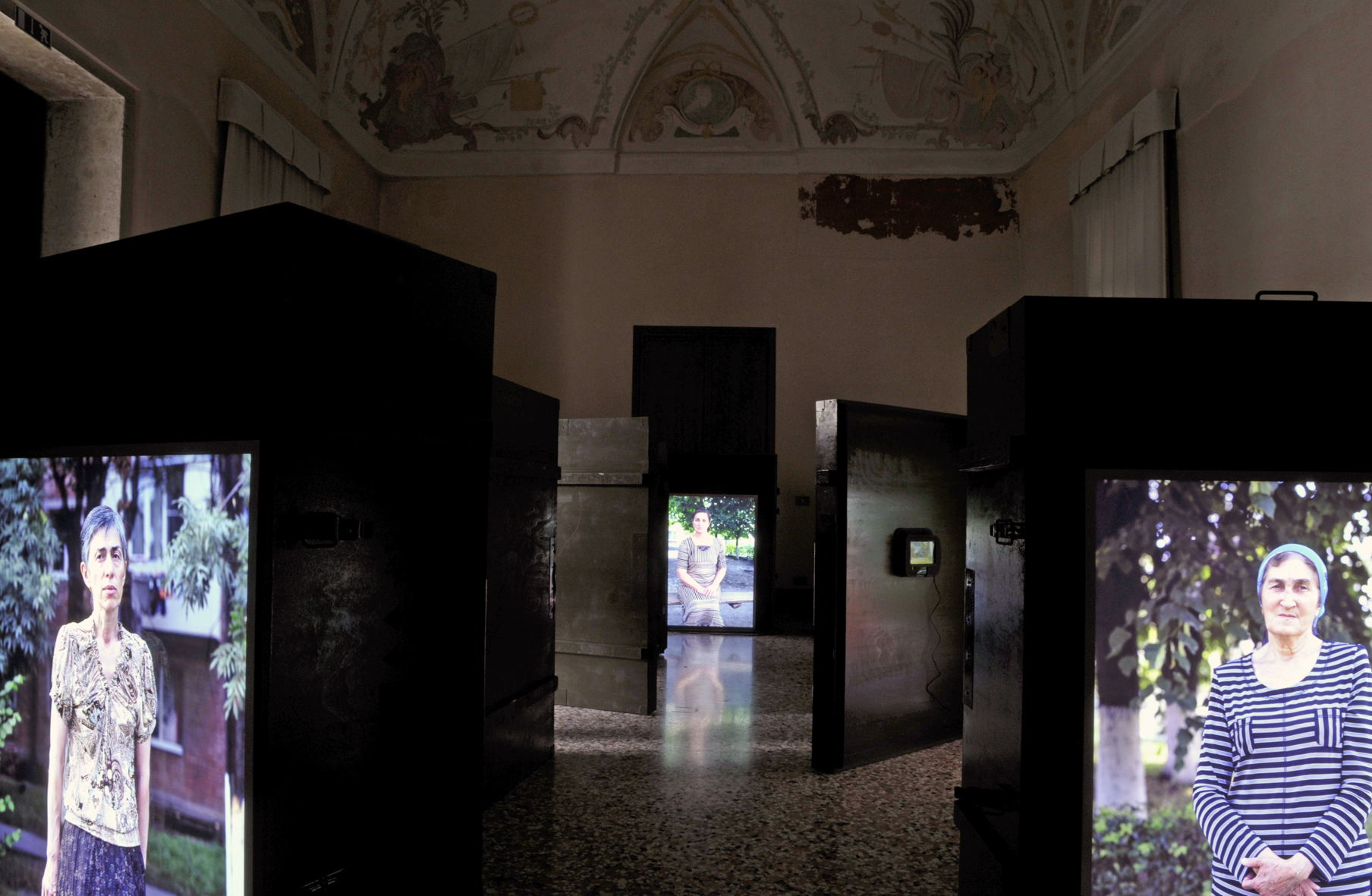 Les malles renferment le portrait de ces femmes tristes qui portent le poids d’un deuil, difficile à porter. Ces portraits photographiques statiques sont confrontés à la marée en mouvement d’informations des différents journaux télévisés internationaux. Le flux violent et sonore s’oppose alors au silence et à la quiétude, dans lequel l’oubli a poussé la tristesse maternelle. Le visiteur s’accroupie devant ces malles pleines de souvenirs, manifestant toute sa compassion pour l’affliction de ces femmes qui ont perdu leurs enfants.