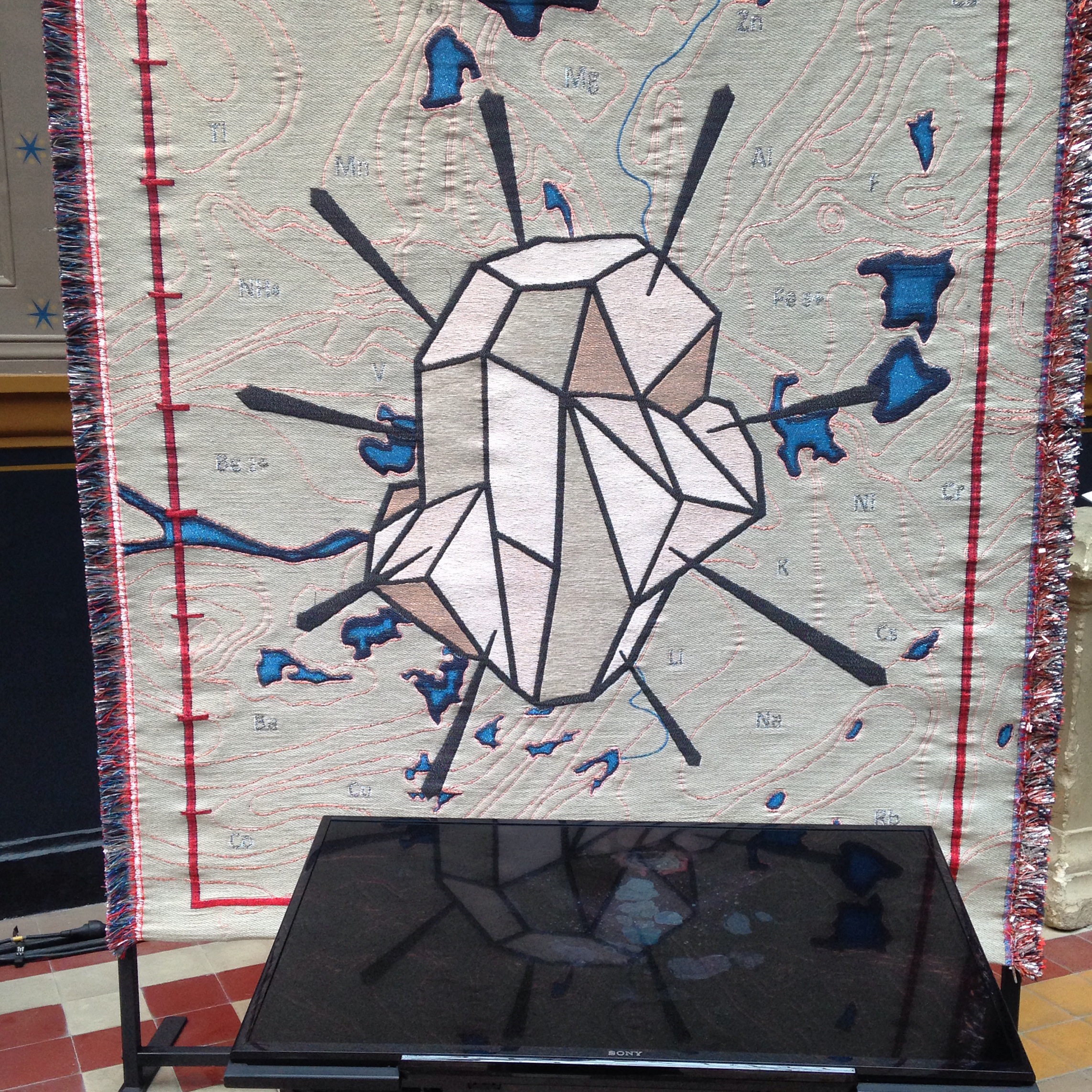 Cette installation est une partie d’une plus grande installation. Enigmatique et captivante, elle se compose d’une vidéo performance de l’artiste interroge cette relation entre l’humain et l’organique, dans une dimension rituelle voire religieuse ; et d’une tapisserie sur laquelle est brodé le symbole graphique d’une pierre précieuse.
