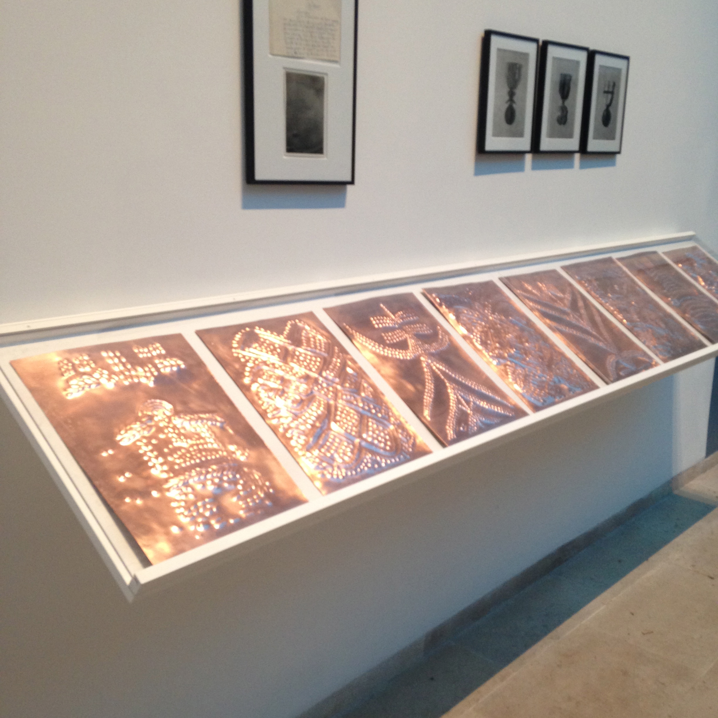 Sammy Baloji, ‘Sociétés Secrètes’, 2015 – Installation composée de 8 plaques de cuivres – 29,7 x 42 cm (chacune) – 4 photographies noir et blanc, une lettre écrite à la main – 16 x 20 cm. Oeuvre Unique – Courtesy de l’artiste et Imane Farès