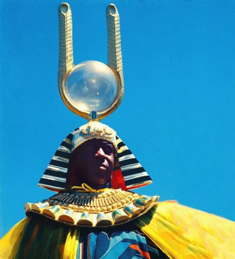 1) Premièrement, Sun Ra (1914-1993) était un visionnaire. Dans un contexte marqué par la conquête de l’espace de la fin des années 1950, il a vu à travers l’avènement de l’«Ere Spatiale» une promesse, pour lui et des camarades noirs, d’échapper à un pays qui considère leurs vies et leurs attentes comme sans importance. Nommée “Arkestra” son arche spatiale conduit alors ses compagnons noirs vers une Terre nouvelle afin de reprendre l’Histoire. Ainsi, Sun Ra devient l’Archange Saturnien, un descendant du dieu égyptien du Soleil et dont la mission est de prêcher la paix.