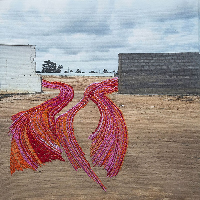 Photographie prise avec l’iPhone, imprimée sur une toile et brodée à la main avec du coton 24 x 24 cm / Photo Crédit: Joana Choumali