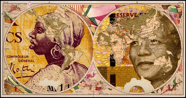 La musicalité des compositions nous transporte vers de nouvelles contrées, de nouveaux paysages. Des détails nous sautent aux yeux; on distingue un planisphère, des silhouettes, des corps, des visages connus – d’anciens hommes politiques comme Nelson ou Mobutu – ou inconnus. Des bribes d’histoires se détachent ci et là pour raconter des histoires de l’Histoire.