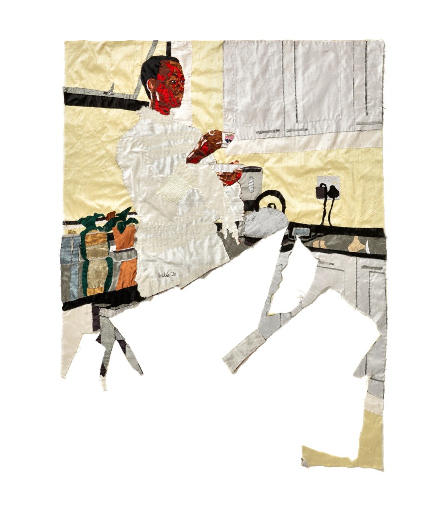 En lien permanent avec la société, les oeuvres de Billie Zangewa nous propulsent dans son intimité: » Je partage mes expériences personnelles avec le spectateur en offrant simplement une représentation directe d’un événement spécifique, ou quelque chose qui revient sans cesse et demande de l’attention. Dans mon travail figuratif, j’utilise ma propre personne comme personnage central. Bien que je raconte mon histoire en utilisant mon image, les thèmes sont universels et peuvent servir à tout le monde. Je raconte vraiment mes histoires personnelles qui traitent des thèmes universels. »